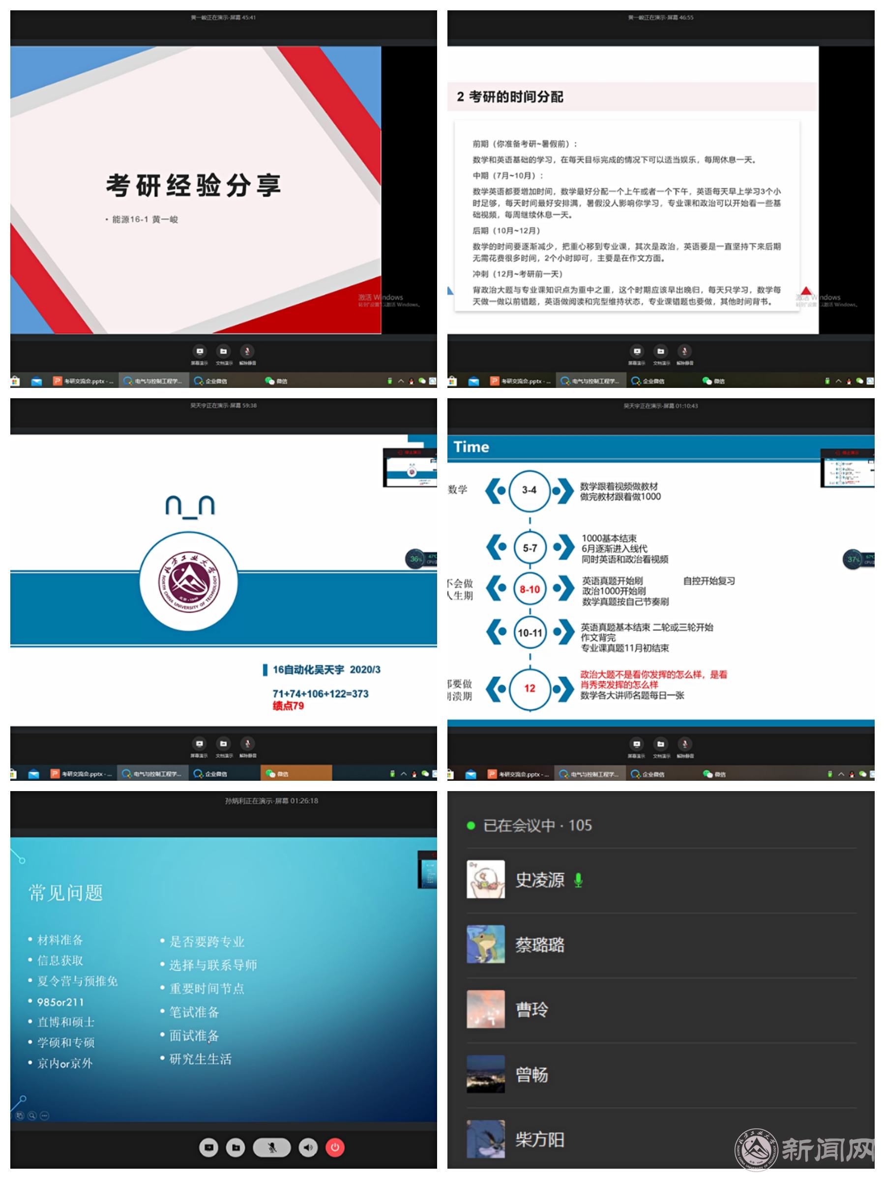 3月21日下午,電控學院通過企業微信舉辦了2017級線上考研動員暨經驗交流會。16級各專業今年考研成績突出的史凌源、臧益果、黃一俊、吳天宇以及成功保研的孫炳利等同學主講。五位同學根據自身的經驗,分別向17級的各位同學介紹了如何系統地進行考研備戰,為大家“傳經送寶”。會議由輔導員王磊老師主持。