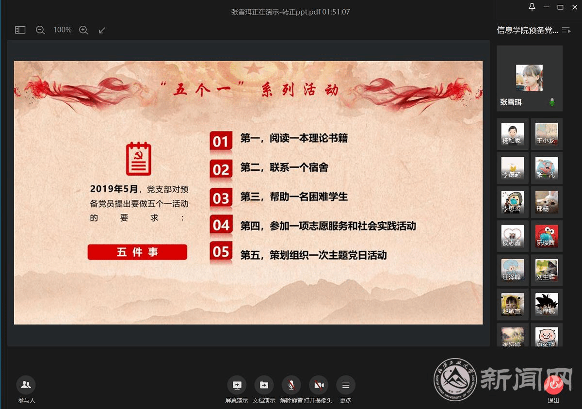 匯報過程中,預備黨員從閱讀一本理論書籍、聯系一個宿舍、幫助一名困難學生、參加一項志愿服務和社會實踐活動、策劃組織一次主題黨日活動等五個方面的內容對預備期一年的履職盡責情況作了匯報,并逐一解答了有關提問。受疫情影響,部分工作開展起來有困難,但是預備黨員們敢于克服困難,及時調整方案,將”五個一”先鋒工程內容落到實處,不忘初心,牢記使命。