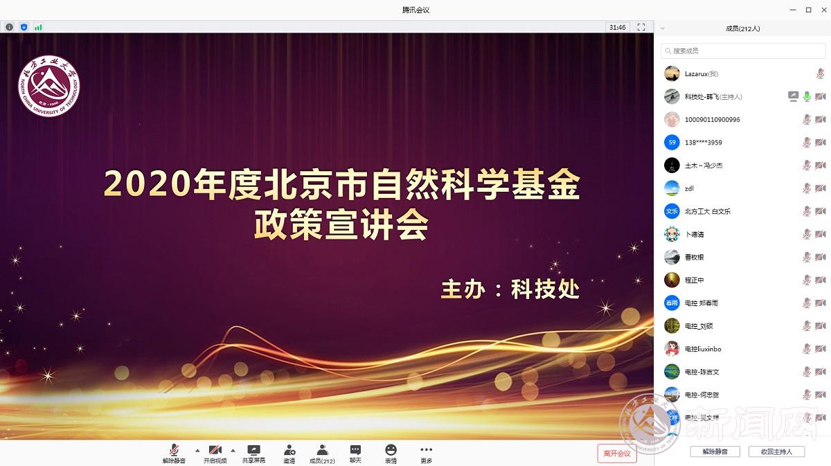 6月24日上午,為進(jìn)一步提升基金項(xiàng)目申報(bào)率和資助率,科技處組織召開了2020年北京市自然科學(xué)基金項(xiàng)目宣講會(huì)。因疫情原因,本次宣講會(huì)采用了線上會(huì)議的模式,共計(jì)210余位教師參加了本次宣講會(huì),會(huì)議由科技處副處長(zhǎng)韓飛主持。