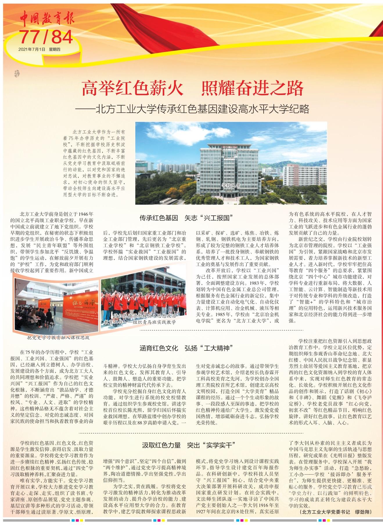 7月1日,在全國上下共慶中國共產黨百年華誕之際,《中國教育報》“慶祝中國共產黨成立100周年特刊·百年大計”以整版篇幅刊載我校深入開展黨史學習教育成效文章。