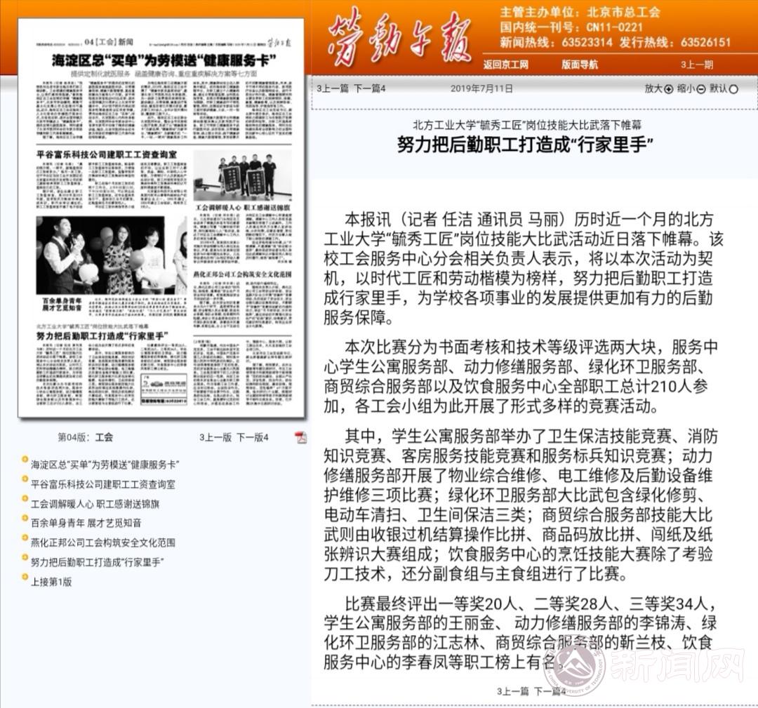 為貫徹落實(shí)北京工會(huì)十四大精神,積極投身首都改革發(fā)展實(shí)踐,以勞模精神、勞動(dòng)精神、工匠精神引領(lǐng)職工人生理想,充分展現(xiàn)現(xiàn)代化建設(shè)主力軍的新時(shí)代風(fēng)采,日前北方工業(yè)大學(xué)服務(wù)中心分會(huì)組織舉辦了“毓秀工匠”活動(dòng)。7月11日,勞動(dòng)午報(bào)發(fā)表了我校題為《努力把后勤職工打造成“行家里手”》的署名報(bào)道文章。