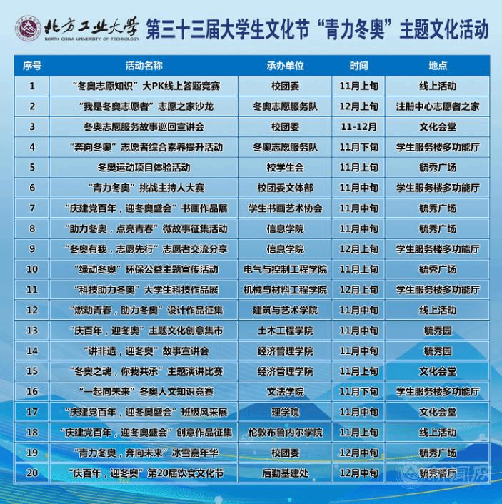 今年恰逢北方工業大學第33屆大學生文化節,學校結合冬奧文化宣傳面向全校師生開展以“青力冬奧”為主題的系列文化活動,將開展冬奧知識競賽、志愿服務故事宣講、書畫作品展、微故事征集、創意集市、冰雪嘉年華等一共20項活動。這些活動將讓更多的師生了解冬奧、支持冬奧、服務冬奧,努力營造濃厚的校園冬奧文化氛圍。