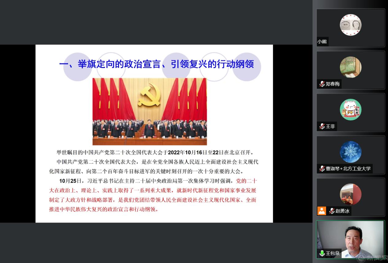 11月18日下午,離退休黨委理論學(xué)習(xí)中心組召開線上學(xué)習(xí)會,專題學(xué)習(xí)黨的二十大精神。離退休黨委委員王包泉作專題宣講,黨委委員、黨支部書記、副書記、支部委員、全體工作人員等近30人參加了學(xué)習(xí),學(xué)習(xí)會由離退休黨委書記趙永兵主持。