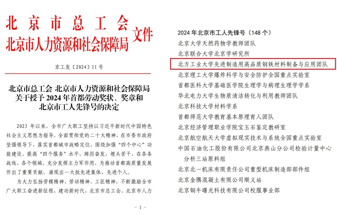 在“五一”勞動節來臨之際,北京市總工會、北京市人力資源和社會保障局公布了2024年首都勞動獎狀、獎章和北京市工人先鋒號評選結果。我校“先進制造用高品質鋼鐵材料制備與應用”團隊喜獲“北京市工人先鋒號”榮譽稱號。