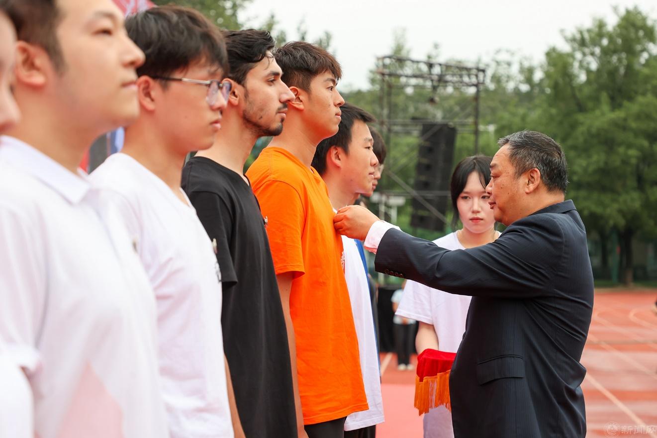 校黨委書記劉軍為新生代表佩戴校徽,歡迎2024級新同學緣聚北方工大大家庭,開啟人生新征程。