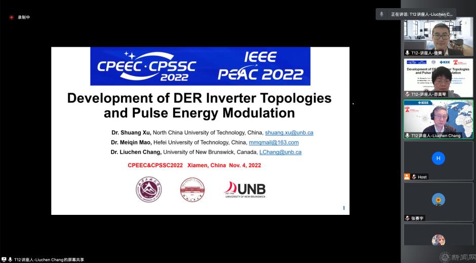 由中國電源學會主辦的2022中國電力電子與能量轉換大會暨中國電源學會第二十五屆學術年會及展覽會(CPEEC & CPSSC 2022)于2022年11月4日-7日在廈門召開,大會旨在促進電力電子、能量轉換與電源技術相關領域學術、技術交流,促進產(chǎn)、學、研的合作,促進相關產(chǎn)業(yè)及產(chǎn)業(yè)鏈的技術創(chuàng)新和進步,為國內外專家學者分享領域內最新研究成果提供交流平臺。我校電氣與控制工程學院徐爽博士受邀以北方工業(yè)大學為第一單位,同加拿大皇家工程院院士張榴晨教授、合肥工業(yè)大學茆美琴教授一起,以“Development of DRE Inverter Topologies and Pulse Energy Modulation”為主題,做了時長為三個半小時的線上特邀大會報告。