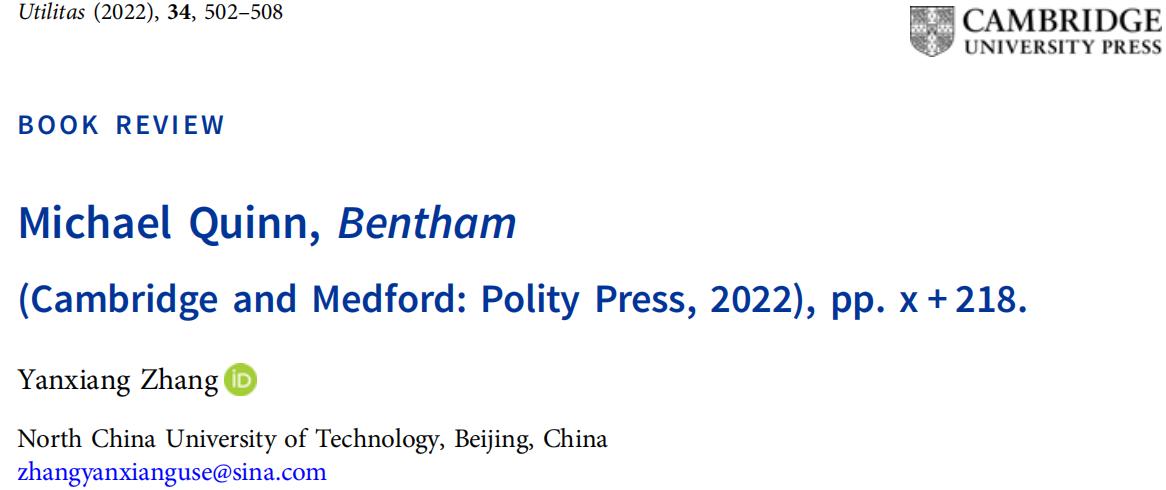 法哲學與道德哲學國際頂尖期刊Utilitas于2022年12月在第34卷第4期刊發(fā)了張延祥副教授獨立撰寫的論文:A Review of Bentham。Utilitas是國際功利主義學會(International Society for Utilitarian Studies)旗下唯一的學術(shù)期刊,在人文領(lǐng)域享有崇高聲譽,由劍橋大學出版社出版。Utilitas被國際人文研究領(lǐng)域的各個權(quán)威期刊目錄收錄,其中包括Web of Science中的藝術(shù)與人文索引目錄(A&HCI),在另一權(quán)威數(shù)據(jù)庫Scopus的學術(shù)期刊排名體系(SJR)中位于Q1區(qū)。