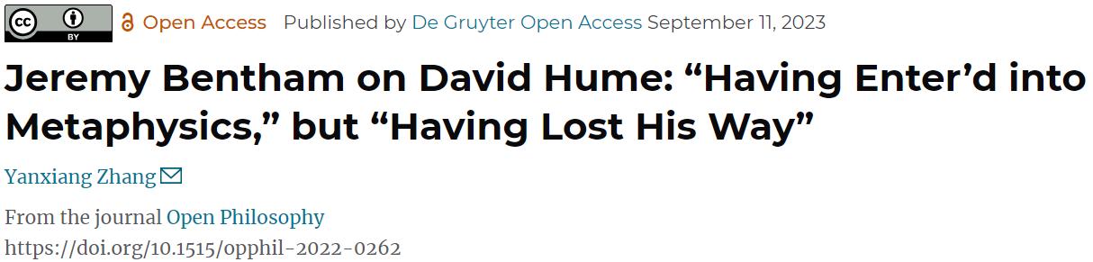 國際哲學權(quán)威期刊Open Philosophy于2023年9月13日在線刊發(fā)了張延祥副教授獨立撰寫的長篇研究論文:Jeremy Bentham on David Hume: “‘Having enter’d into Metaphysics’, but “‘Having Lost His Way’”。