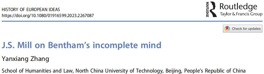 思想史研究領(lǐng)域國際頂尖期刊History of European Ideas于2023年10月9日在線刊發(fā)了張延祥副教授獨立撰寫的長篇研究論文:J.S. Mill on Bentham’s Incomplete Mind。History of European Ideas由當今世界四大學術(shù)出版集團之一的Taylor& Francis出版,被國際人文研究領(lǐng)域的各個權(quán)威期刊目錄收錄,其中包括Web of Science中的藝術(shù)與人文索引目錄(A&HCI),在另一權(quán)威數(shù)據(jù)庫Scopus學術(shù)期刊排名體系(SJR)中位列Q1區(qū)。