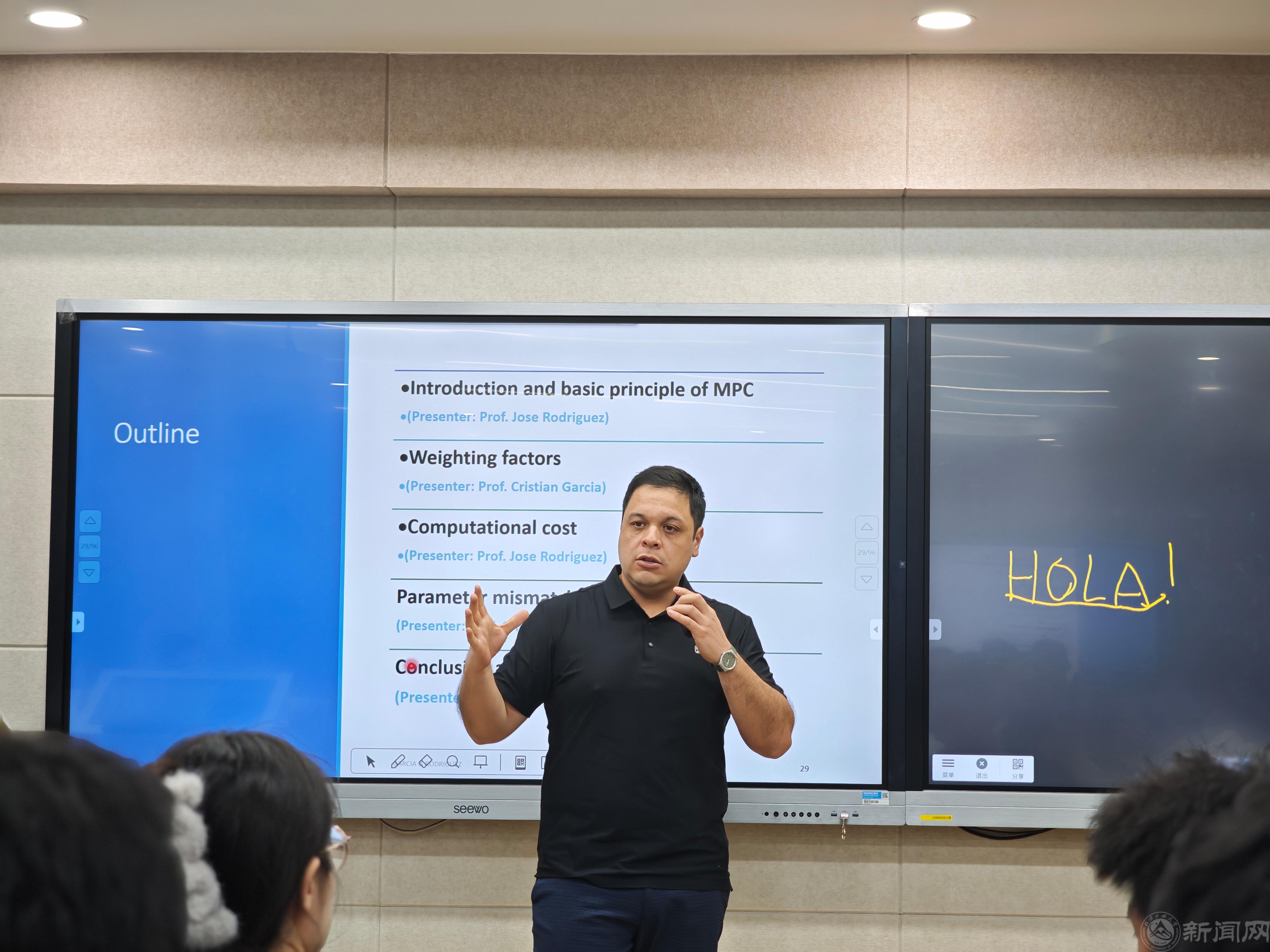 隨后,題為“Predictive Control in Power Electronics: Latest Advances, Applications and Challenges”的學術講座在博遠樓會議室隆重舉行。在報告中,Rodriguez教授和Garcia教授系統梳理了模型預測控制(MPC)技術自誕生以來的發展脈絡。他們首先闡述了MPC的核心概念與基本原理,強調了其概念簡潔、能靈活融入多控制目標以及動態性能優越等顯著優勢。同時,他們也坦誠討論了MPC早期面臨的挑戰,如對數學模型和參數的依賴性以及開關頻率變化等問題,并介紹了國際學術界如何通過持續研究,成功克服了其中大部分難題。
