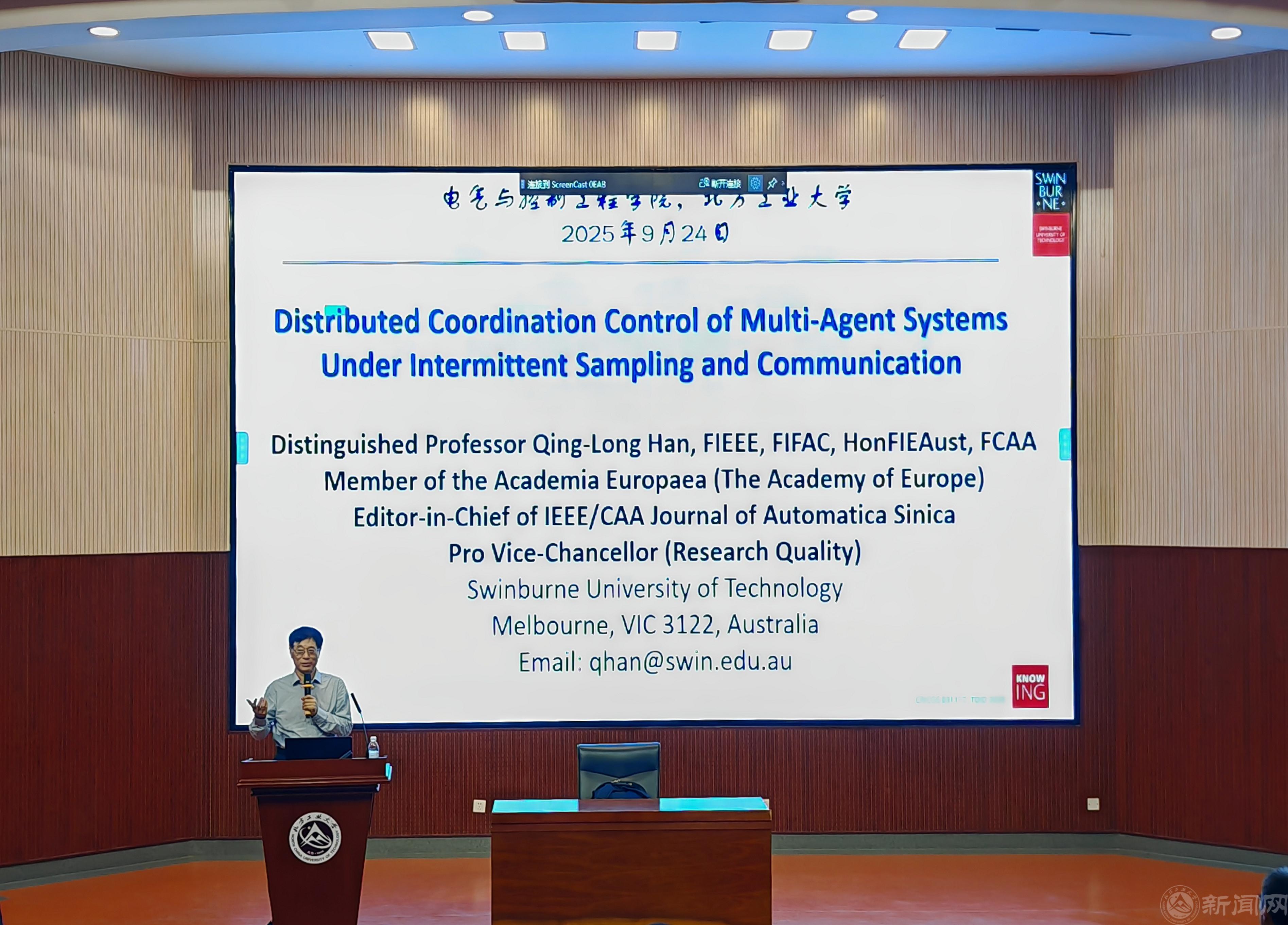 9月24日,歐洲科學(xué)院院士、澳大利亞斯威本科技大學(xué)副校長韓清龍教授在文化會堂為我校控制科學(xué)與工程學(xué)科博士新生講授了“控制科學(xué)與工程前沿專題”開學(xué)第一課。韓清龍院士以“Distributed Coordination Control of Multi-Agent Systems Under Intermittent Sampling and Communication”為主題,為博士生帶來了一場前沿學(xué)術(shù)盛宴。報告由電氣與控制工程學(xué)院院長董哲主持。