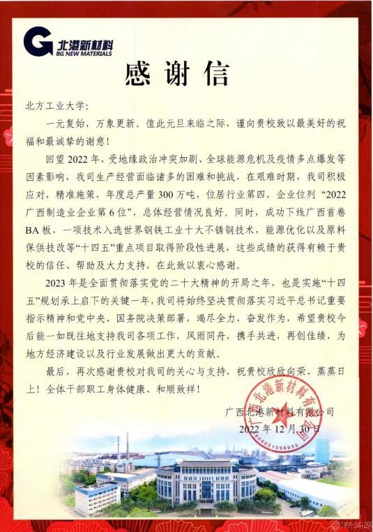 學校深入學習貫徹落實黨的二十大精神,促進科技成果轉移轉化,努力提升服務社會經濟發展能力。近日,廣西北港新材料有限公司向學校發來感謝信,感謝過去一年學校為北港新材料發展提供的關心、幫助與大力支持。