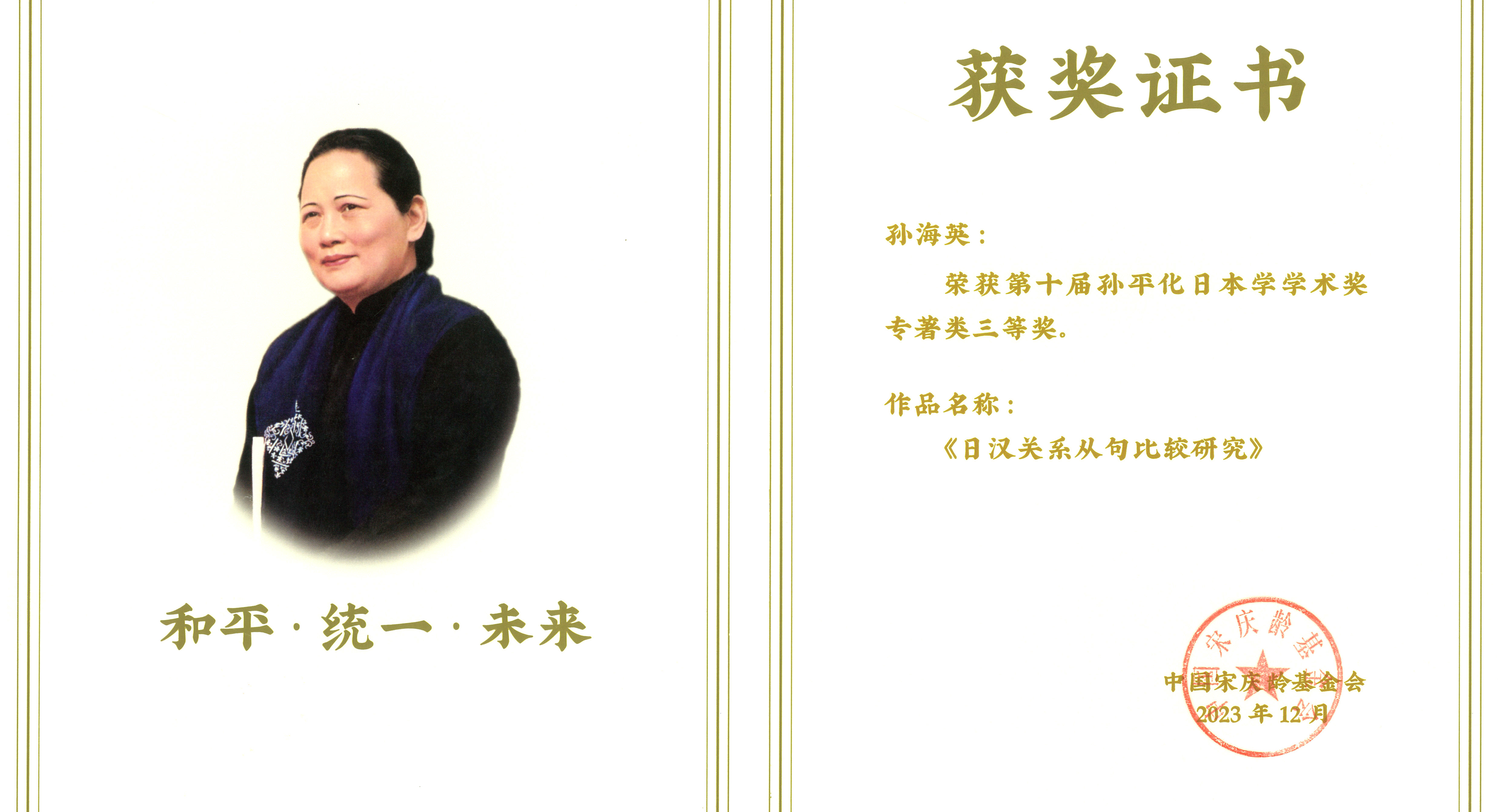 12月21日下午,第十屆“孫平化日本學學術獎”頒獎儀式在中國宋慶齡青少年科技文化交流中心舉行,我校文法學院副教授孫海英著作《日漢關系從句比較研究》(南開大學出版社,2021年11月)光榮獲專著類三等獎,是專著類獲獎成果中唯一一部語言學研究著作。本屆評獎自今年7月啟動以來,共收到參評學術成果115項,為歷屆最多,包括55部專著、42篇論文、18部譯著。經過初審、終審,最終評選出30項獲獎作品,其中,專著10部、譯著6部、...