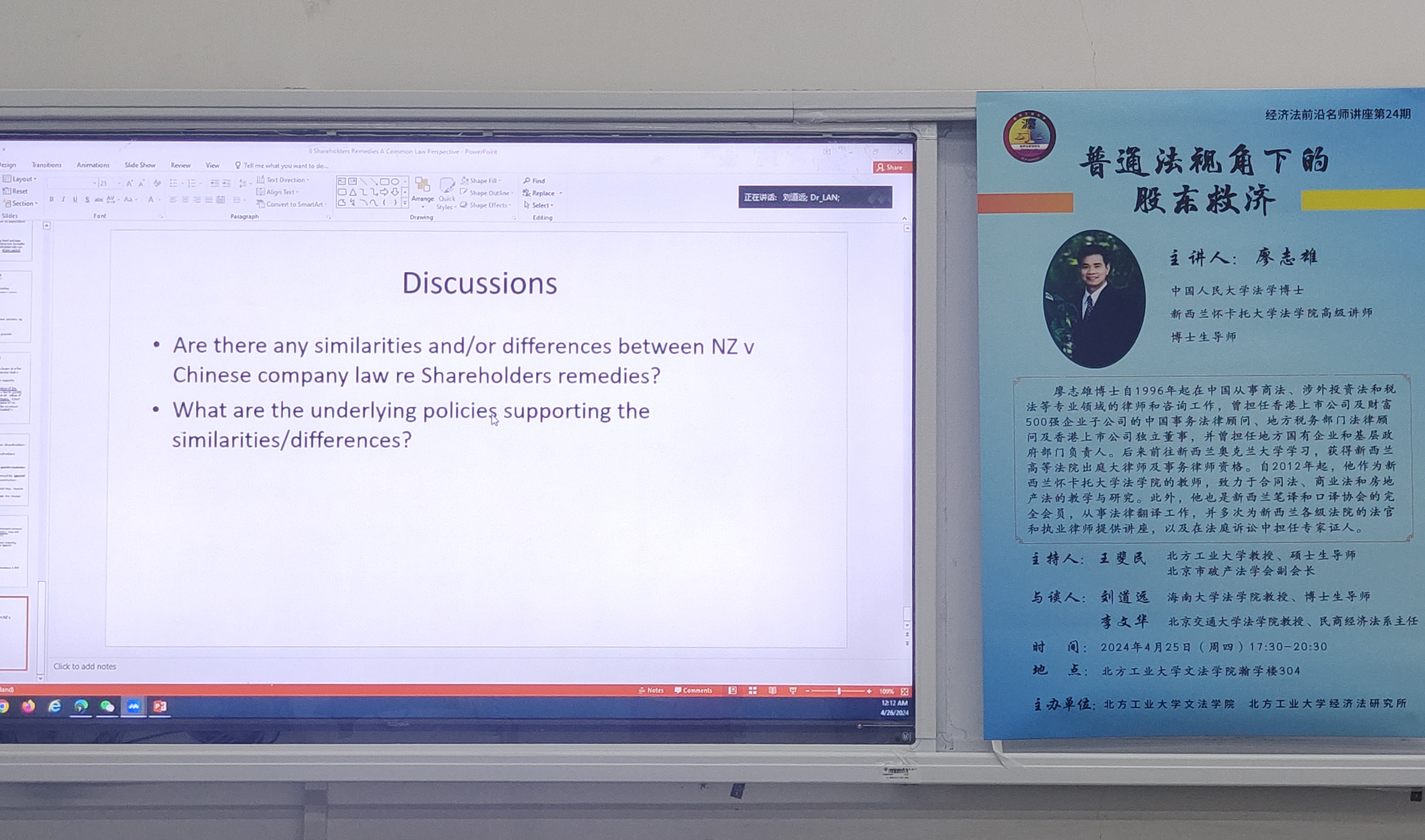 4月25日晚,文法學院和經濟法研究所在瀚學樓304成功舉辦了經濟法前沿名師講座第24期。本次講座以線上與線下相結合的方式舉行,由新西蘭懷卡托大學法學院高級講師、博士生導師廖志雄以“普通法視角下的股東救濟——以新西蘭法為例”為題進行主旨演講。海南大學法學院教授、博士生導師劉道遠教授和北京交通大學法學院教授、民商經濟法系主任李文華教授擔任本期講座的與談人。北方工業大學文法學院教授、北京市破產法學會副會長王...