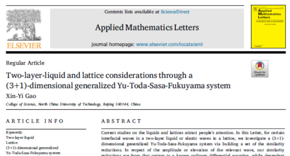 近日,我校理學(xué)院教師高心怡在AppliedMathematicsLetters(應(yīng)用數(shù)學(xué)快報(bào))發(fā)表的標(biāo)題為T(mén)wo-layer-liquidandlatticeconsiderationsthrougha(3+1)-dimensionalgeneralizedYu-Toda-Sasa-Fukuyamasystem[通過(guò)(3+1)維廣義Yu-Toda-Sasa-Fukuyama系統(tǒng)考察雙層液體和晶格]的文章入選“ESI熱點(diǎn)論文”。AppliedMathematicsLetters為SCI檢索一區(qū)top期刊,高心怡發(fā)表的論文旨在解析研究描述雙層液體中若干界面波或晶格中若干彈性波的(3+1...