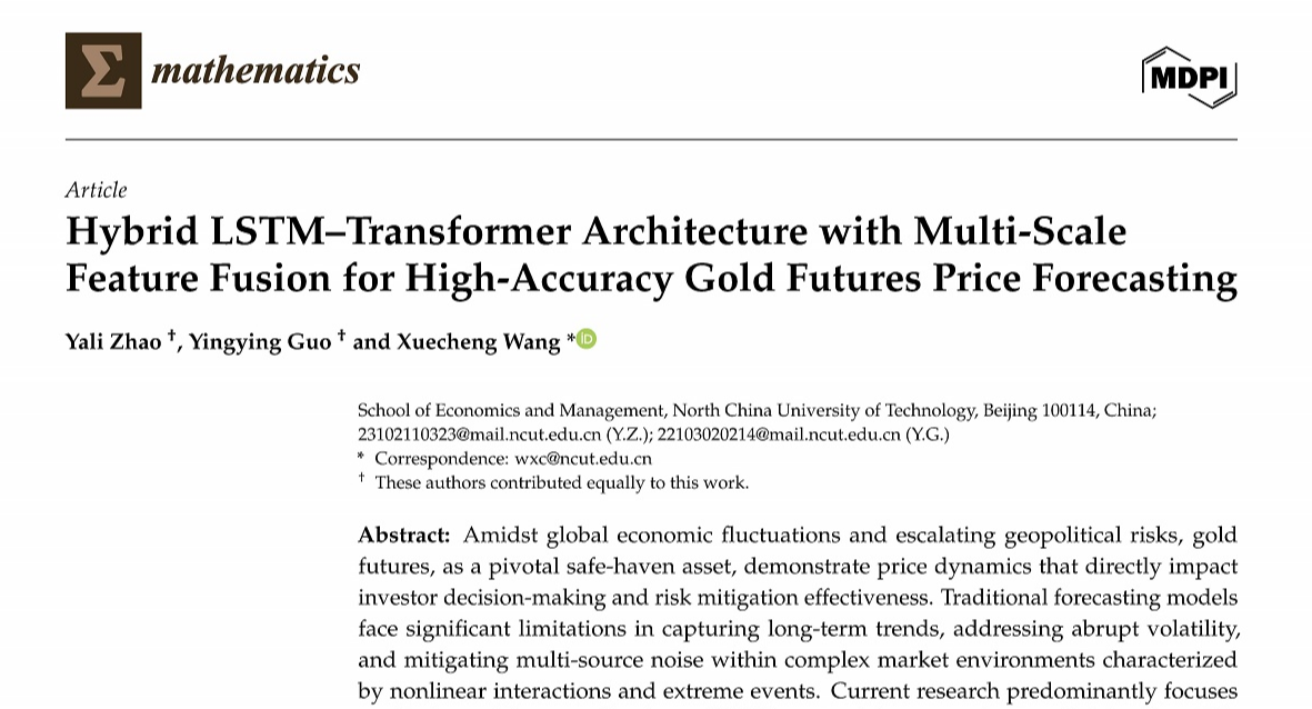 5月8日,經濟管理學院經濟與金融專業本科生在《Mathematics》期刊(JCR分區Q1)發表題為《HybridLSTM-TransformerArchitecturewithMulti-ScaleFeatureFusionforHigh-AccuracyGoldFuturesPriceForecasting》的學術論文。該研究成果由大學生創新創業訓練計劃項目孵化,王學成老師指導,經濟與金融專業本科生趙婭麗、郭盈盈共同完成。論文將LSTM-Transformer混合架構模型引入傳統金融產品價格分析中,構建起高可靠性的預測系統,具...