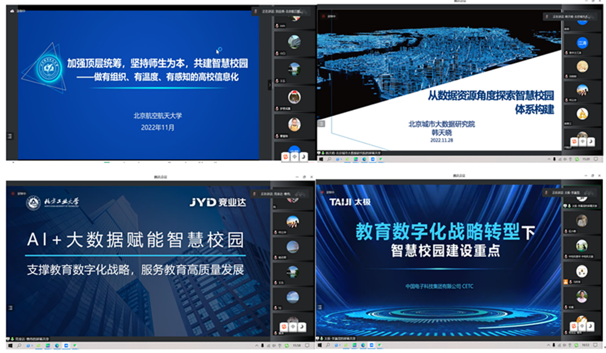 為落實《北京市教育委員會關于開展智慧教育專項規(guī)劃和頂層設計評審工作的通知》精神,加快提升學校信息化工作的整體水平,11月28日下午,學校召開智慧教育專項規(guī)劃和頂層設計線上研討會。會議邀請了北京航空航天大學網絡信息中心副主任劉金揚,北京城市大數據研究院有限公司副總經理韓天曉,北京競業(yè)達數碼科技有限公司副總裁、教學與校園研究院院長曹偉,北京中電普華信息技術有限公司副總經理任強,中電太極(集團)有限公司...