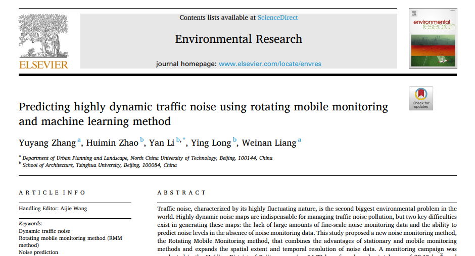 近日,建筑與藝術學院教師張雨洋、梁瑋男在國際知名環(huán)境健康期刊《EnvironmentalResearch》發(fā)表了題為《Predictinghighlydynamictrafficnoiseusingrotatingmobilemonitoringandmachinelearningmethod》(使用旋轉移動監(jiān)測和機器學習方法預測高動態(tài)交通噪聲)的最新研究成果(doi.org/10.1016/j.envres.2023.115896)。《EnvironmentalResearch》在WebofScience收錄的325種環(huán)境科學期刊中排名第19,IF=8.431,是中科院2區(qū)TOP期刊...